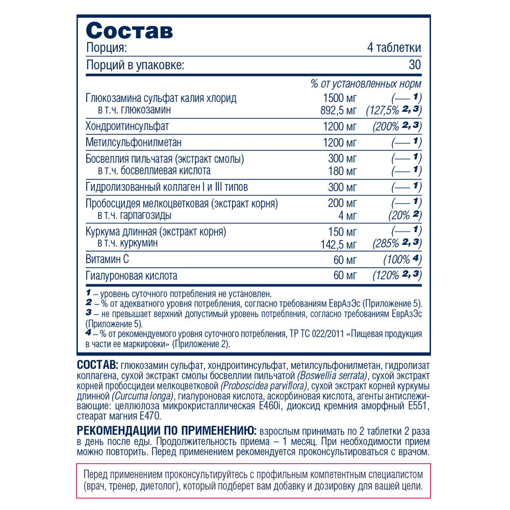 Только натуральные компоненты включены в формулу добавки – это растительные экстракты и вещества, составляющие основу хрящей и сухожилий из природного сырья. Все составные части добавки имеют точно рассчитанное количество и соотношение, позволяющее им наиболее эффективно взаимодействовать, взаимно усиливая действие друг друга и минимизируя вероятность побочных эффектов.