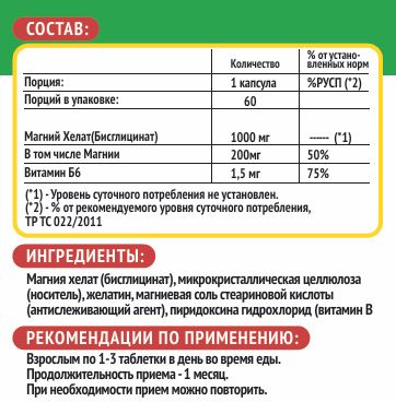 Отличный состав этого комплекса, без лишней химии, без диоксида титана, все чётко и то что нужно. В одной таблетке 200 мг магния - это хорошая дозировка, по сравнению с аптеными препаратами и выгодна по деньгам. К тому же магний находится в хелатной форме, это самая лучшая форма для усвоения нашим организмом. А витамин В6 как раз-так помогает усвоится магнию. Банки хватает на месяц. Результат употребления заметен сразу, перестал дёргается глаз, стала менее раздражительная, пропали судороги. Вообщем
