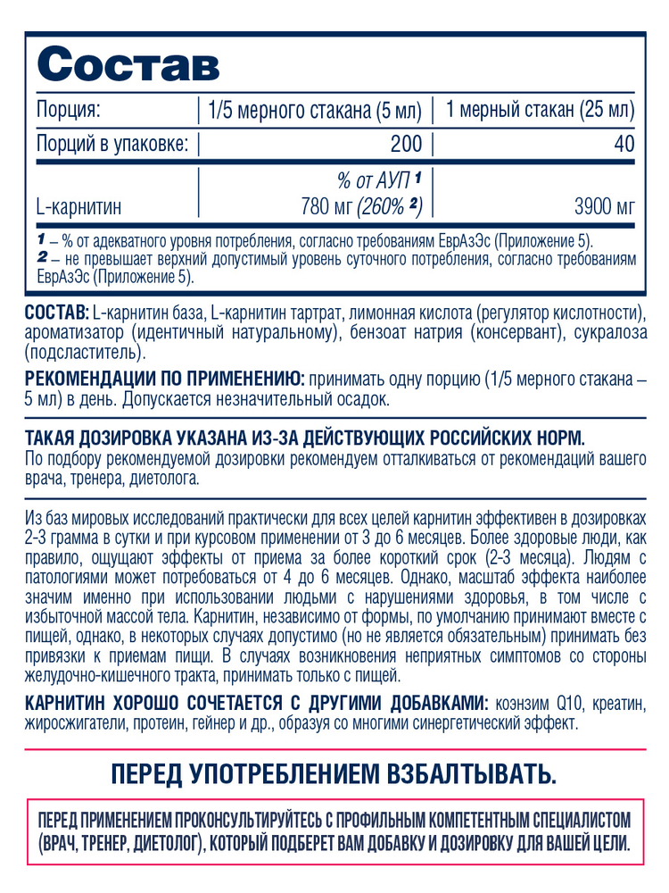 Состав: L-карнитин база, L-карнитин тартрат, лимонная кислота (регулятор кислотности), ароматизатор (идентичный натуральному), бензоат натрия (консервант), сукралоза (подсластитель).