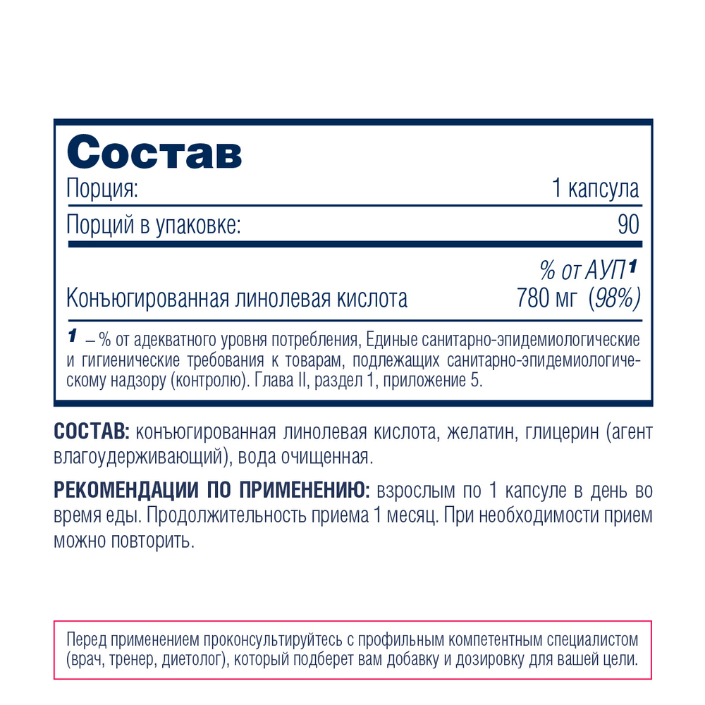 Состав: конъюгированная линолевая кислота, желатин, агент влагоудерживающий глицерин Е422, вода очищенная